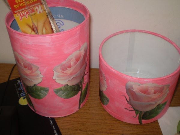 Primeiro passei Primer para metais, pet e vidro. Depois passei tinta Pva branca, quando secou eu usei tinta rosa para o acabamento e um pouco de branca para ir manchando, recortei as flores do papel e colei com cola branca comum, após secagem passei verniz fosco para dar acabamento.