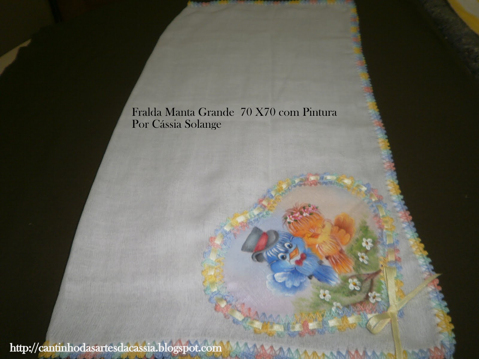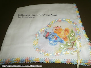 Olha as fraldas com aplicação pintadas, bico de crochê com linha de algodão de boa qualidade, e fita de cetim.
